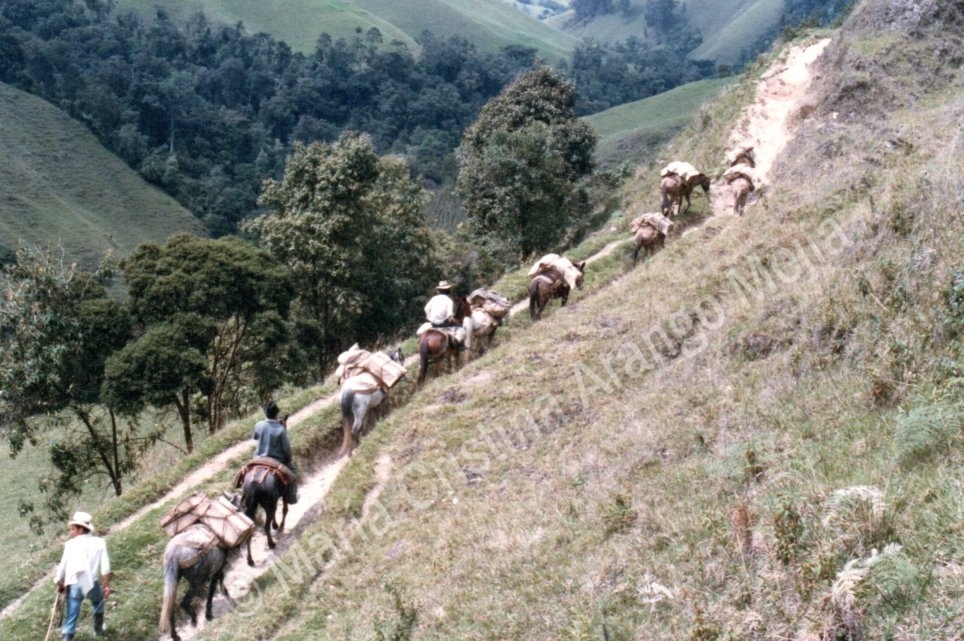 Era un agradable espectáculo para los campesinos observar las recuas de 20 mulas cargadas, dirigidas por el tilín-tilín de la campanera, con el sangrero, el caporal y los arrieros distribuidos a lo largo de la caravana pendientes de los malos caminos, de la carga que se ladeaba, de la mula que caía y de las otras recuas que marchaban en sentido contrario por el estrecho camino. Además, los alegres letreros bordados en la frentera de las mulas despertaban sonrisas: «Adiós mi vida», «Dios me guía», «Adiós mi amor», «Adiós faltonas».